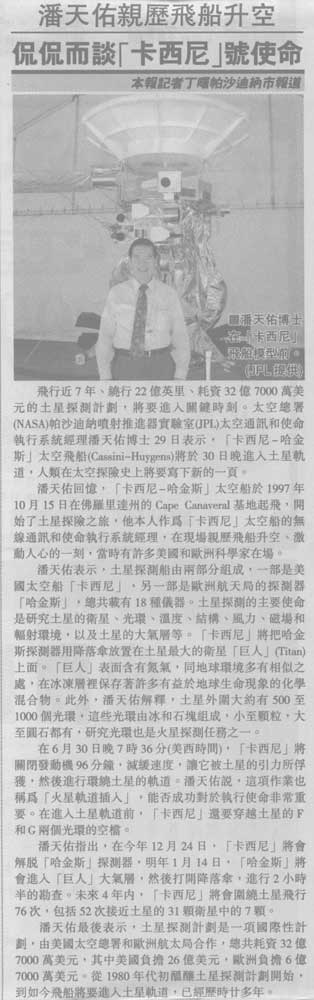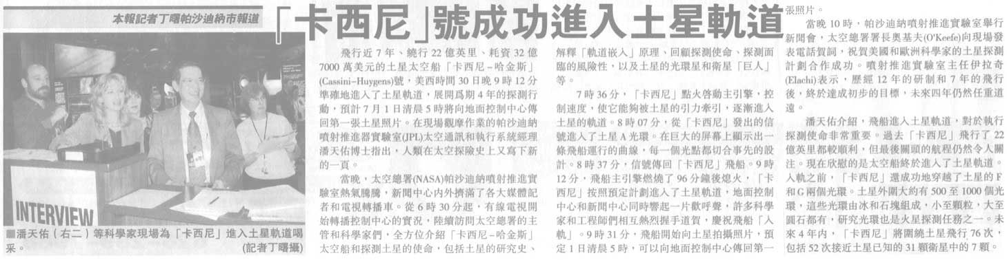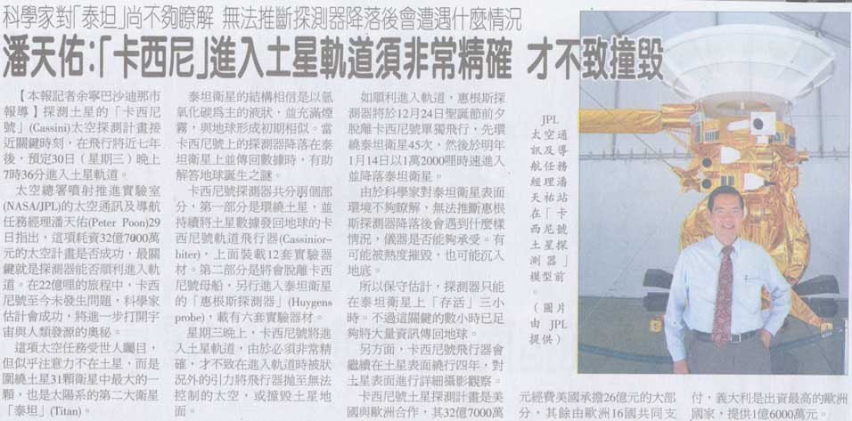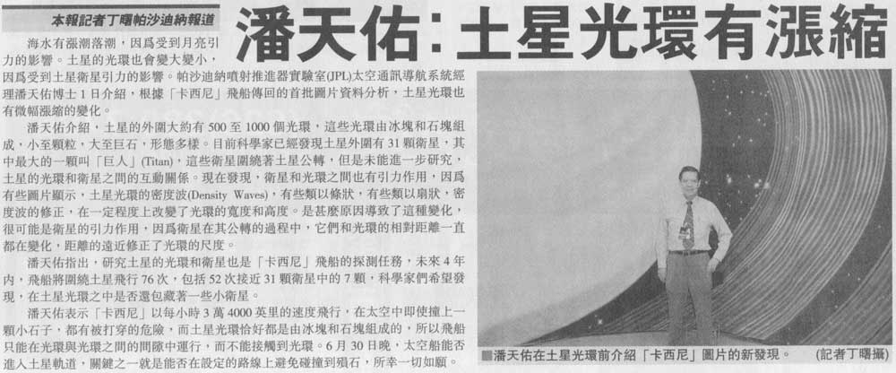 On July 1, 2004, after a 7-year journey, the Cassini-Huygens space probe crossed Saturn's Ring Plane, and after some maneuvers, started orbiting the second largest planet of our Solar System. Peter Poon, as in previous major NASA space events, is again hot in the news everywhere.